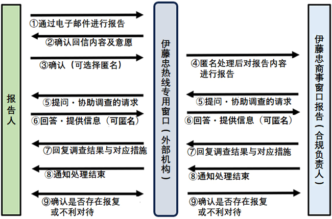 伊藤忠商事的内部报告制度,在国内外分别设置了多个报告受理窗口(利用专业公司以及外部律师的外部报告受理窗口等),受理来自伊藤忠商事管理人员及员工、与伊藤忠商事另行签订劳务派遣合同的公司根据该劳务派遣合同向本公司派遣的人员 (派遣员工)、以及集团公司员工等的报告。另外,禁止对内部报告人员实施报复等不利行为,并允许以匿名方式进行报告。报告的事实及内容将被严格保密,此外,关于热线的设立及使用方法,也通过在公司内网公告以及合规培训等方式进行宣传和告知。
