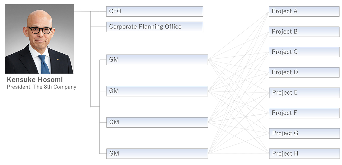 The 8th Company does not have departments or sections based on product categories like existing Business Companies. Rather it has a flexible amoeba-type structure in line with its adoption of a market-oriented perspective.