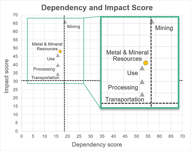 Specifically, we used the natural capital impact assessment tool “ENCORE” developed by the United Nations Environment Programme and other organizations, to categorize the activity processes along the value chain, including both upstream and downstream of our business, according to the processes defined by ENCORE. Then, by consolidating businesses with similar processes, we formed 28 groups. For each of those groups, we calculated the score for each dependency and impact while taking into account the degree of our involvement and other factors in the businesses in our value chain. We evaluated the dependency of each business on natural capital in six stages and totaled the dependency score. We also evaluated the impact in the same way in five stages and totaled the impact score. For instance, we can break down the evaluation of Metal & Mineral Resources businesses into the following elements. The average of the evaluation scores for each of these business processes is shown as the results of this analysis.