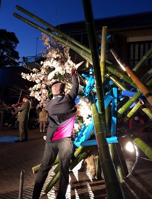 Being planned with hopes of disaster recovery, "Happy Island - Blossoming in the Future -- Art Exhibition 'God of Flowers - Advent (I)' by IKEBANA Artist Hiroki Maeno" was held from Saturday, March 8 to Sunday, March 16 with the hope of reconstruction after the Great East Japan Earthquake. Aonoinori took place as an event for expressing the wish for recovery using flower, music and Noh dancing on Monday, March 10, the day before the third anniversary of the Great East Japan Earthquake. Hiroki Maeno, IKEBANA Artist , put flowers on the driftwood coming from the affected area, and Reijiro Tsumura, a Noh performer, performed dances along with the musical performance by Iwao Furusawa, a violinist, and Keiko Daito, a cellist. Their performance aimed at giving a prayer for requiem and regeneration. Over one hundred audiences visited the gallery despite the cold weather like the day of the disaster, watching the performance in silence.