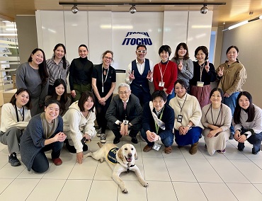 ITOCHU Europe has been supporting “The Guide Dogs for the Blind Association’” since 2022 and naming and supporting a puppy to become a potential guide dog through the “Name a Puppy” fundraiser. In February 2026, “Yoshi”, a puppy named after our corporate mission “Sampo-yoshi”, made his first visit to ITOCHU Europe. Many staff members gathered and enjoyed the visit of the almost 8-month-old Yoshi. Yoshi will start her training when he turns 1 years old, and we will continue to support his to successfully become a guide dog.