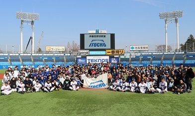 On Saturday, February 14, ITOCHU Baseball Class was held at Meiji Jingu Stadium. This class has been held since 2007 to encourage children with disabilities to enjoy playing baseball. 46 children were paired with employee volunteers from 20 ITOCHU Group companies. While interacting with the employees, children experienced throwing, hitting, and base-running with coaches from the Tokyo Yakult Swallows Baseball Academy. A total of 211 people, including the children's families, enjoyed the class this year.