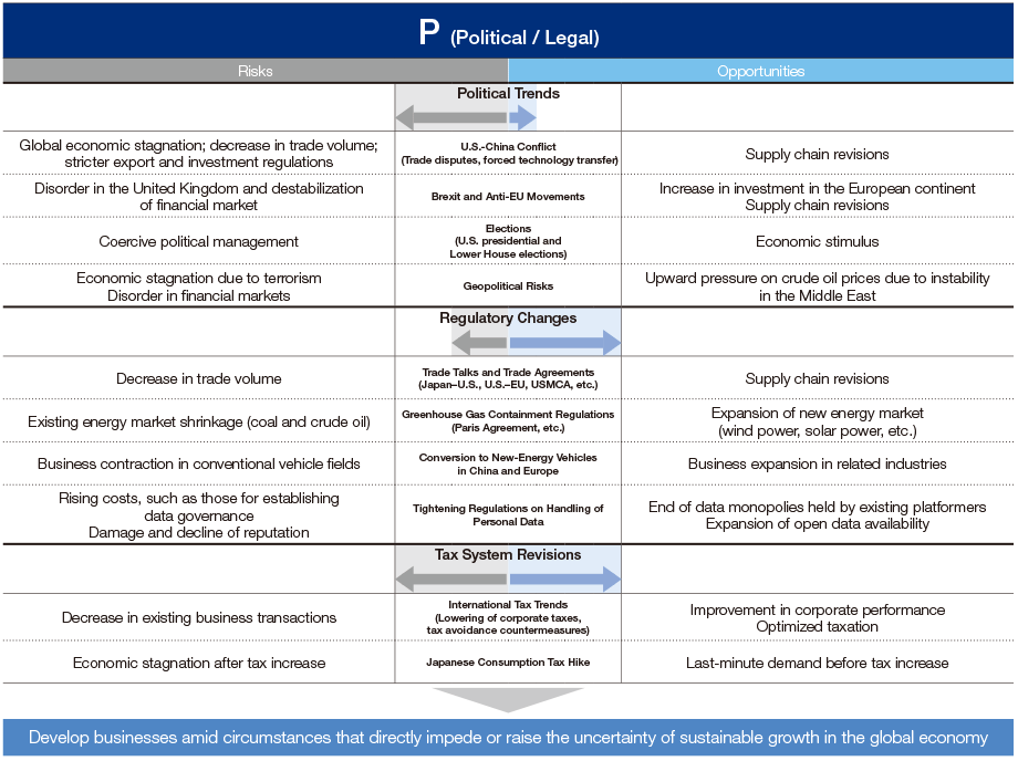 The management environment surrounding ITOCHU is changing at a constantly accelerating pace. We are conducting PEST analysis to understand the inherent macroenvironmental risks and opportunities that we will face during the period of our medium-term management plan, “Brand-new Deal 2020,” and are building a competitive edge by adapting to macroenvironmental changes.