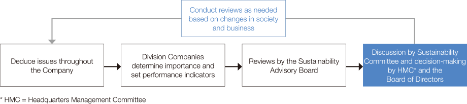 The Sustainability Management Division plans measures to advance sustainability. After these are decided by the CAO, they are carried out by each organization. The Sustainability Committee deliberates and makes decisions concerning formulation and revision of basic policies and important matters. Through dialogue with stakeholders such as the Sustainability Advisory Board, we gain an understanding of society’s expectations and demands, etc., which we use in our efforts to promote sustainability.