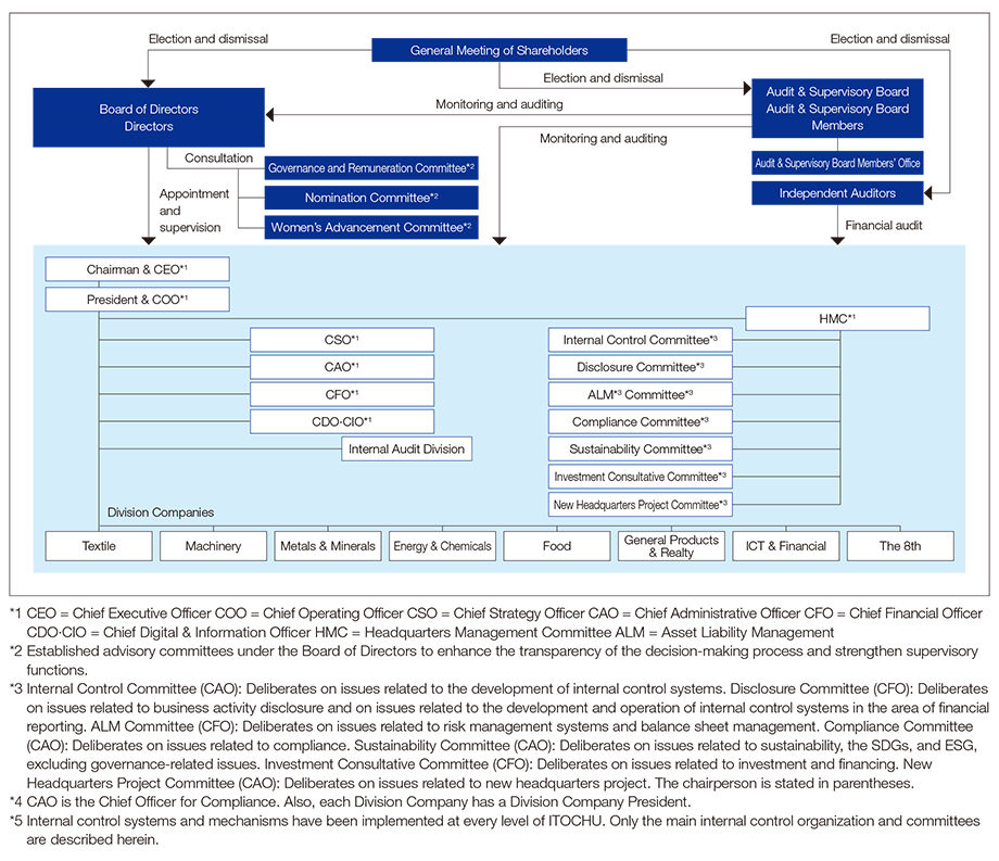 ITOCHU has consistently reformed and strengthened its governance structure through such measures as implementing measures pursuant to the Corporate Governance Code, shifting to a monitoring-focused Board of Directors, and establishing advisory committees to the Board of Directors that are led by a diverse group of outside officers. Expectations have increased significantly with respect to the further enhancement of corporate governance as a consequence of revisions to the Corporate Governance Code, which call for “Enhancing Board Independence” and “Promoting Diversity.” In response, in FYE 2022 the Company appointed two outside officers who have abundant experience and expertise in corporate management. Moreover, the Company established the Women’s Advancement Committee to accelerate measures in support of the advancement of women. ITOCHU will continue examining methods of further enhancing its governance, with a particular focus on the practical aspects of strengthening governance.