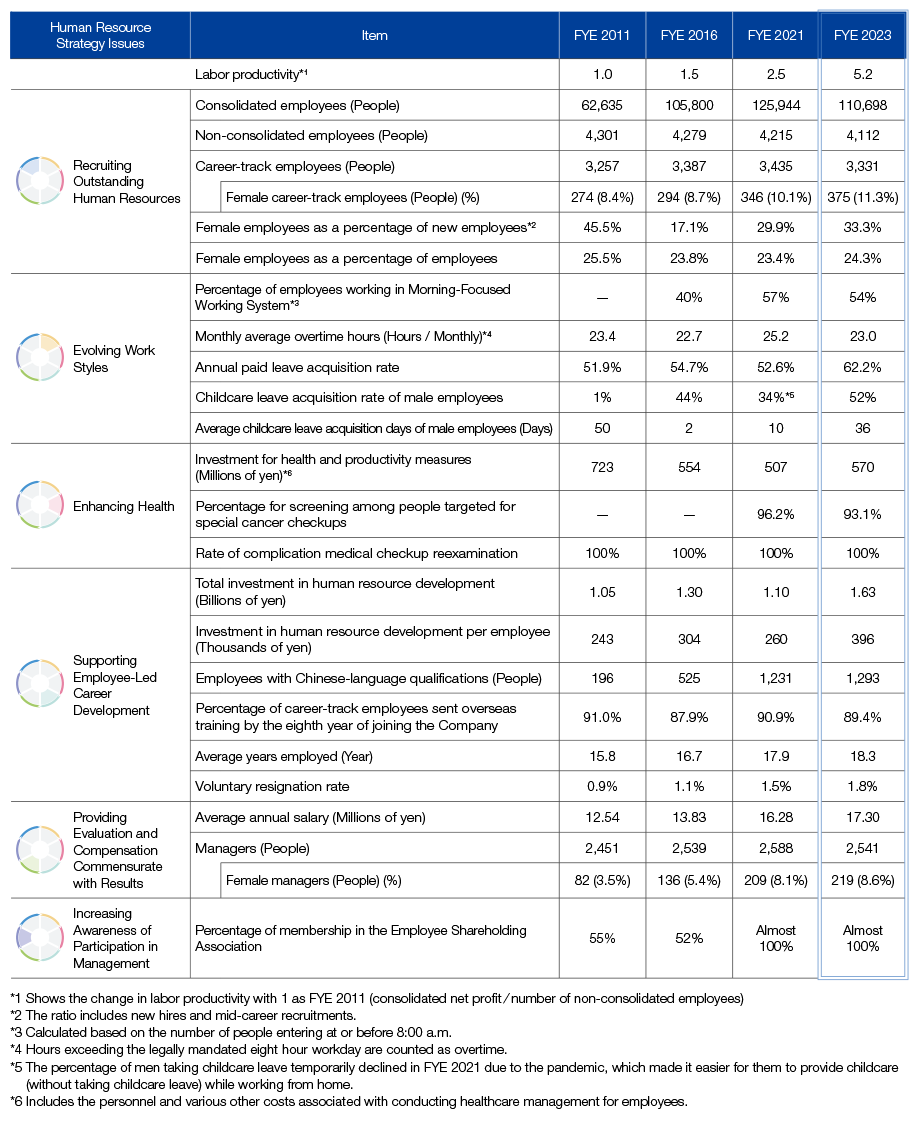 As well as improving employee motivation and labor productivity, our successful creation of a frontline-focused rewarding workplace environment in which every employees can fully realize their capabilities, while strengthening our front-line capabilities, is creating a virtuous cycle that results in a favorable external reputation enabling us to recruit outstanding human resources.