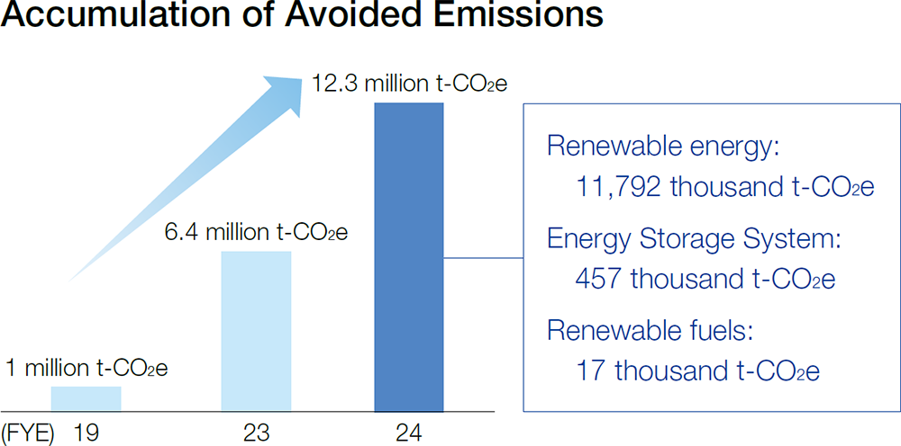 Avoided emissions are quantifications of the GHG emissions reductions that can be realized in the value chain by replacing existing (baseline) products and services with new products and services. In FYE 2024, our avoided emissions reached 12.3 million t-CO2e through the expansion of renewable energy businesses centered on the power generation business. We aim to create a volume of avoided emissions that exceeds our GHG emissions by 2040.