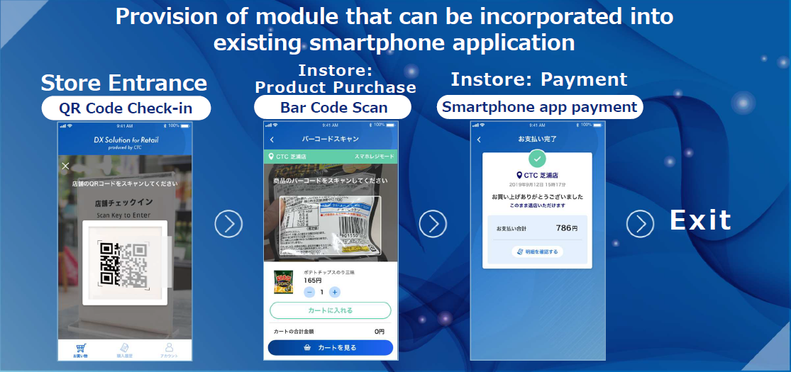 With ready-made functions for self-checkout in an unmanned store where customers scan a QR Code to enter the store and do everything from reading the barcodes of purchased goods to paying with electronic money on their smartphones, or for walkthrough payment where the entire shopping process is completed without checkout through the use of product shelves with weight sensors and AI cameras, CTC DX Solution for Retail makes it possible to deliver a smart store without spending time selecting equipment or designing and developing applications and without spending money on developing systems independently.
