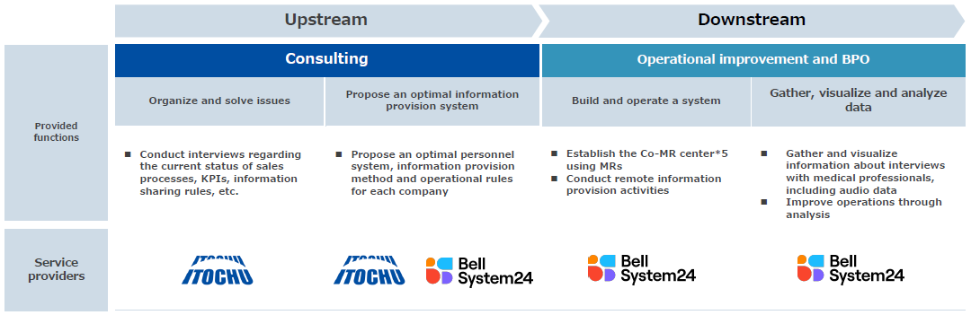 Now, ITOCHU has combined its expertise in marketing and sales, alonog withBELLSYSTEM24's IT, digital technologies, and BPO functions to establish a business that supports the digital transformation (DX) of pharmaceutical companies in the field of marketing. Specifically, ITOCHU leads the upstream domains where corporate marketing and sales issues are solved, and BELLSYSTEM24 is responsible for downstream domains which involve the establishment of an optimal information delivery system using human resources and digital technologies, their application in everyday operations and the evalution of outcomes.Together, we willsupport pharmaceutical companies transform marketing activities and streamline operations, with a focus on enhancing the information provision activities of MRs.