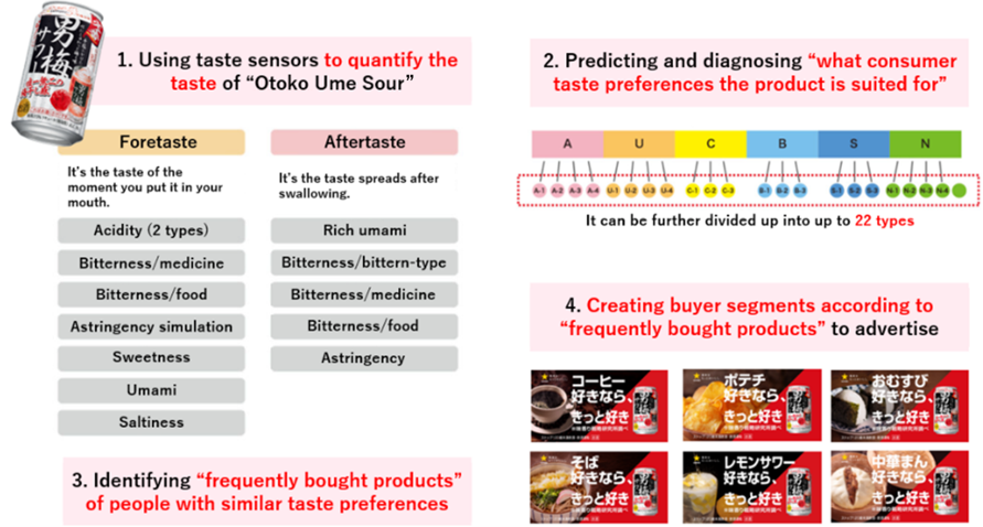 In recent times, the advertising service has been implemented with the goal of improving customer experiences of “Sapporo Otoko Ume Sour,” sold by Sapporo Breweries Ltd. More specifically, we quantified the taste of “Sapporo Otoko Ume Sour” using taste sensor technology to predict and diagnose what consumer taste preferences the product is suited for. Moreover, we identified products that people with that taste preference frequently purchase and ran promotional advertisements that linked those products with the product in question. As a result, about 30% of consumers who viewed the advertisement and purchased the product were new users who had not bought “Sapporo Otoko Ume Sour” in the past year. We also saw an increase in click-through and purchase rates compared to conventional advertising. (Please refer to the figure below for the concrete implementation process.)