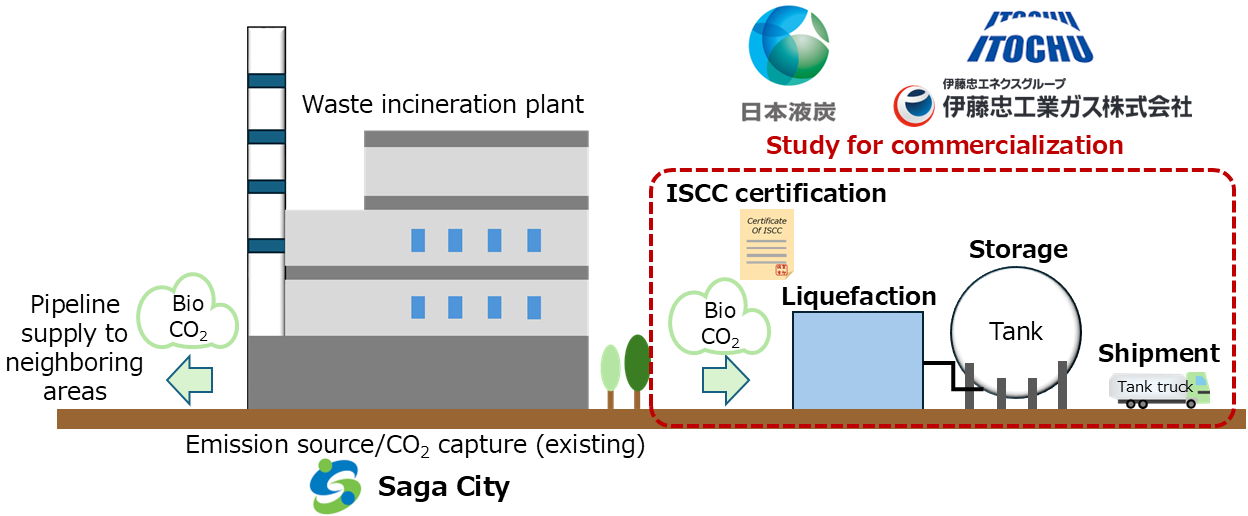 ITOCHU Corporation (Headquartered in Minato-ku, Tokyo; Keita Ishii, President & COO; hereinafter “ITOCHU”) announced today that it has signed a memorandum of understanding regarding a joint study for the commercialization of the bio-based CO2 Liquefaction (hereinafter the “MOU”) with Saga City (Mayor: Hidetaka Sakai), Nippon Ekitan Corporation. (Head Office: Minato-ku, Tokyo; Hiroyuki Iizuka, President; hereinafter “Nippon Ekitan”) and Itochu Industrial Gases Co., Ltd. (Head Office: Chiyoda-ku, Tokyo; Ken Watanabe, President; hereinafter “Itochu Industrial Gases”) to conduct a joint study on the feasibility of liquefying and commercializing bio-based carbon dioxide (hereinafter “CO2”) recovered at the Saga City Clean Center.