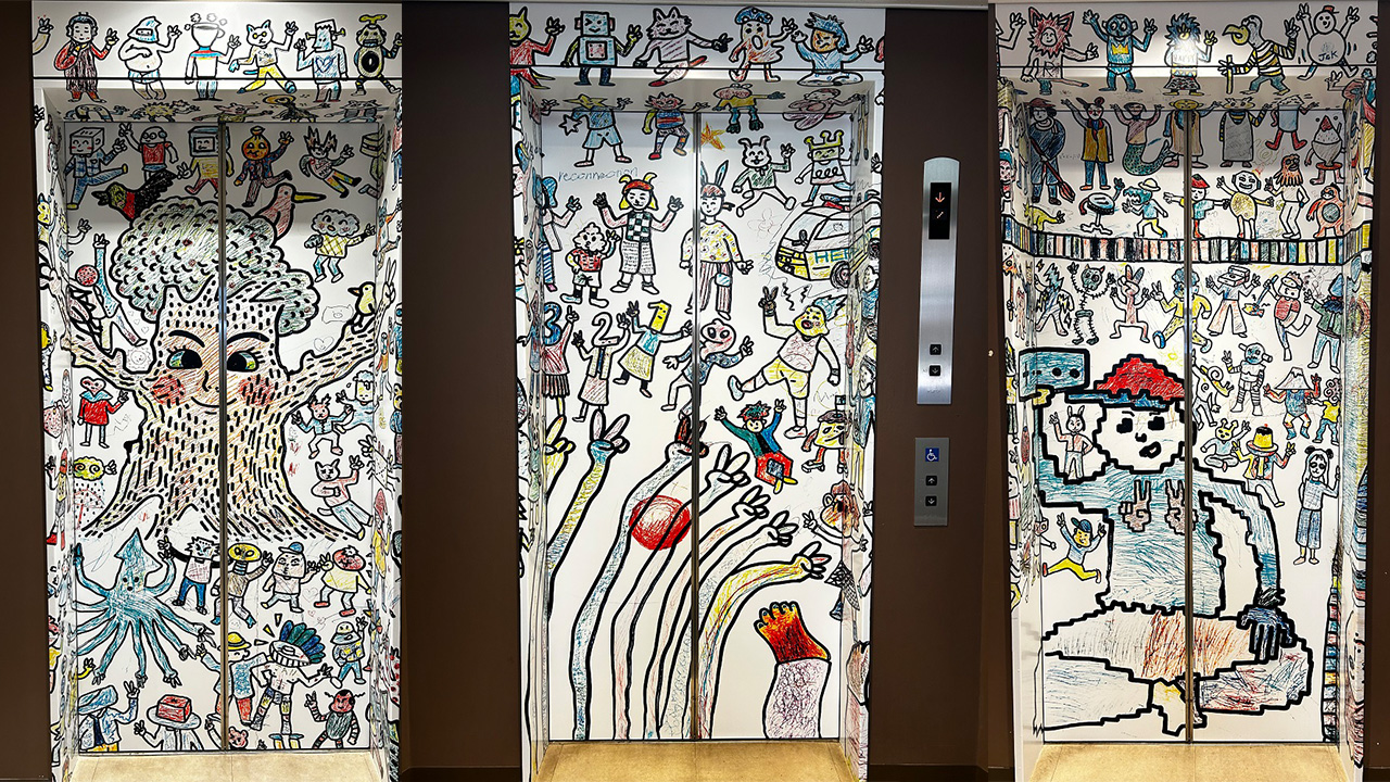 2023年12月に開催した「異彩の軌跡展 with ヘラルボニー」展で作家・笠原鉄平氏がライブペインティングで制作したアート作品「みなでピース」が、2024年3月26日(火)より当施設エレベーターをラッピング。