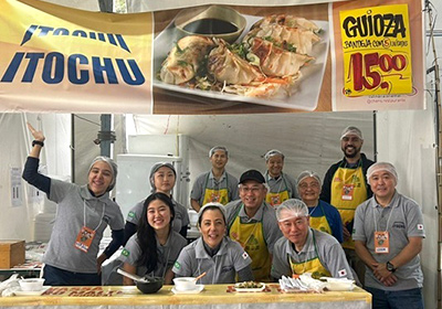 伊藤忠ブラジル会社では、1958年にサンパウロで開園した、主に日系人を対象とする老人ホーム「憩いの園」にて毎年行われるバザーに例年参加しています。バザーにはナショナルスタッフ・駐在員・家族計34名が参加し、8月16日・17日の2日間にわたり餃子の屋台を運営。社員からの寄付金で材料などを仕入れ、屋台の収益金を全て寄付します。2025年は、寄付金と売り上げから材料費を差し引いて、合計14,354レアルを寄付できました。また、伊藤忠ブラジル会社としても5,200レアルを憩いの園に寄付しました。