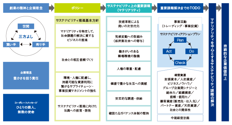 当社は、「三方よし」の精神のもと、企業理念や外部環境の変化を踏まえた「サステナビリティ推進基本方針」を定め、組織的・体系的に推進しています。優先的に解決すべき重要課題(マテリアリティ)を「サステナビリティアクションプラン」に落とし込むと共に、当社グループの事業活動を通じて、持続的な企業価値向上と社会課題解決の両立を実現していきます。