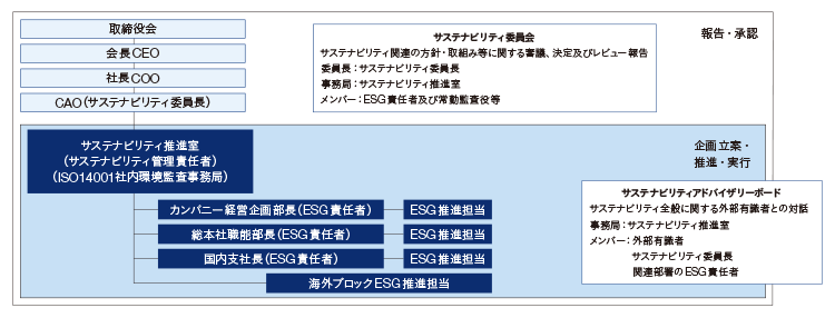 全社サステナビリティ推進に関する方針の策定や重要な案件について、主要な社内委員会の一つである「サステナビリティ委員会」で議論・決定しています。