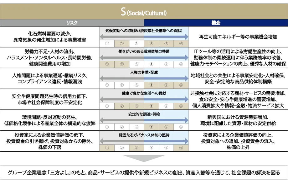 当社グループを取巻く経営環境は、更に不透明感を増しながら日々刻々と変化しています。PEST分析を通じて、新型コロナウイルスや米中貿易摩擦等のマクロ環境要因の影響を踏まえた非財務資本に係る「リスク」と「機会」を十分に把握し、環境変化に応じて柔軟に対応・適応していくことで、更なる競争優位を構築していきます。