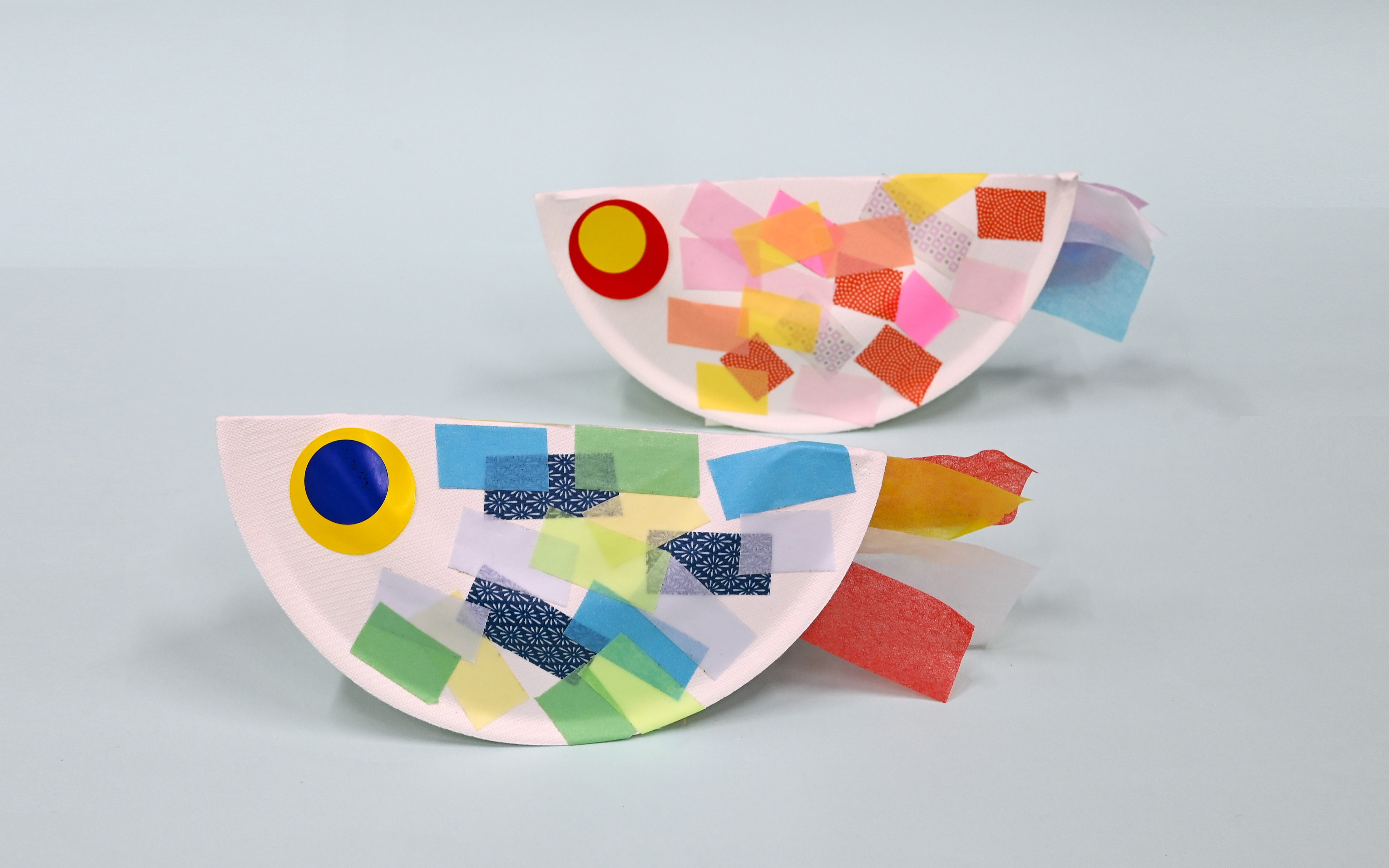 紙皿とマスキングテープを使って、オリジナルのこいのぼりを作るワークショップです。 テープで自由に模様をデザインして、「ゆらゆら」と泳がせてみよう。