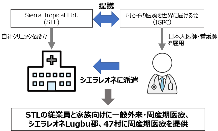STLは、従業員および事業地域住民への医療提供を目的に、2021年4月に自社クリニックを設立しました。IGPCと提携し、現在、STL自社クリニックに日本人医師1名・看護師4名を派遣して、STLの従業員と家族向けに一般外来・周産期医療及び、シエラレオネLugbu郡47村を対象に周産期医療を提供しています。今般、IGPCと医療提携契約を締結し、この取組をSTLの地域貢献活動における中核プロジェクトと位置付け、日本人医師・看護師の安定的派遣とハイリスク妊婦対応医療の提供、クリニックにおけるシエラレオネ医療人材の教育・育成を通じて地域貢献の継続・拡大を目指していきます。
