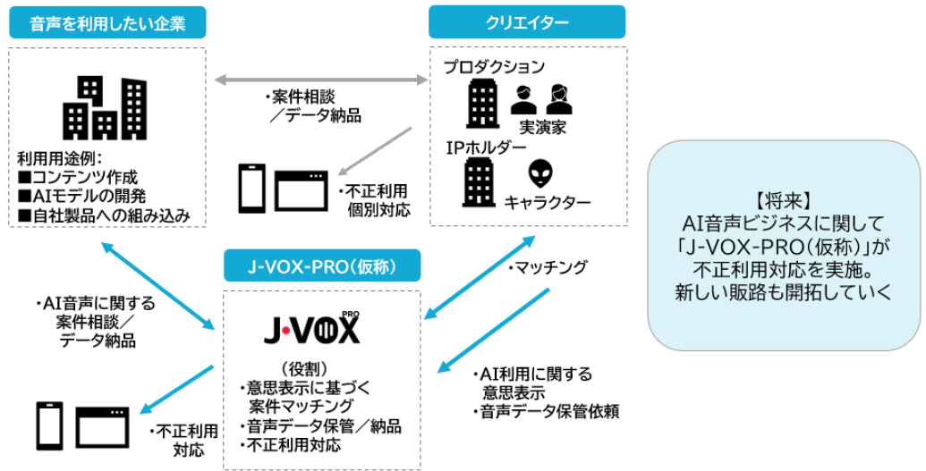 また、「J-VOX-PRO(仮称)」は、法人利用を前提としており、利用希望企業や団体は所定の料金を支払い、合意された用途の範囲で音声データを入手・利用できます。料金や利用条件は、実演家本人やプロダクションとの協議を経て、透明性の高い形で決定されます。また、実演家本人の意志表示のデジタル化を進め、利用企業とのマッチングと併せて、音声データには、電子透かしや声紋などのセキュリティ技術を適用し、利用時の不正を防止します。